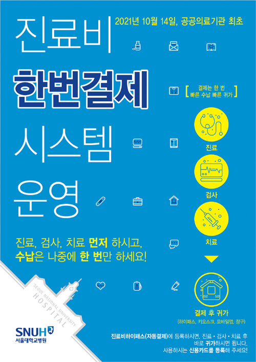 서울대병원은 공공의료기관 최초로 14일부터 ‘진료비 한번결제 시스템’을 운영한다. ‘진료비 한번결제 시스템’은 모든 진료와 검사, 치료를 마친 뒤 일괄수납하는 것을 말한다. 기존에는 검사와 투약, 처치를 위해 원무창구를 여러 번 방문해야 했지만 앞으로는 귀가 전에 한 번만 수납하도록 관련 절차를 개선했다. 불필요한 이동과 대기시간이 줄어 환자 편의가 높였다. 특히 전체 검사항목의 약 80%를 그동안 선수납으로 운영해 한번결제의 효과가 클 것으로 기대하고 있다.