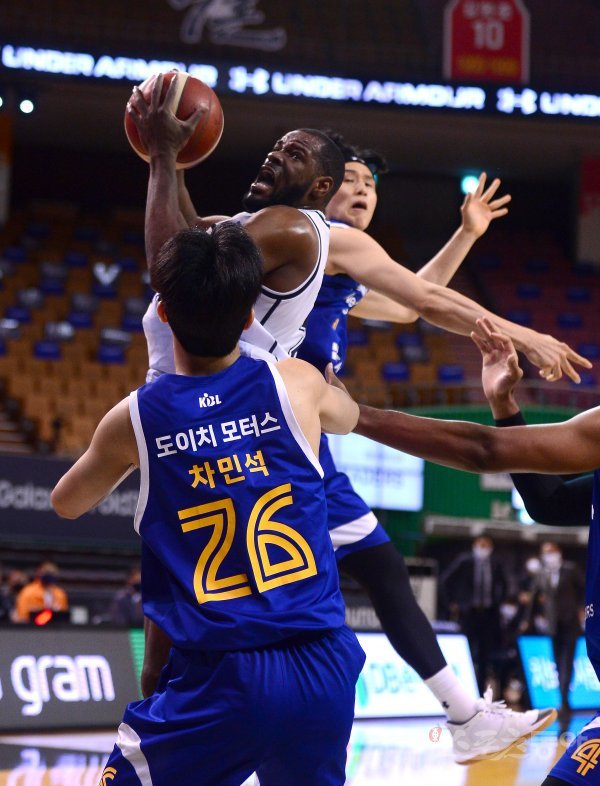13일 서울 잠실체육관에서 열린 ‘2021-2022 프로농구’ 서울 삼성과 전주 KCC 경기에서 KCC 윌리엄스가 리바운드 볼을 잡고 있다.