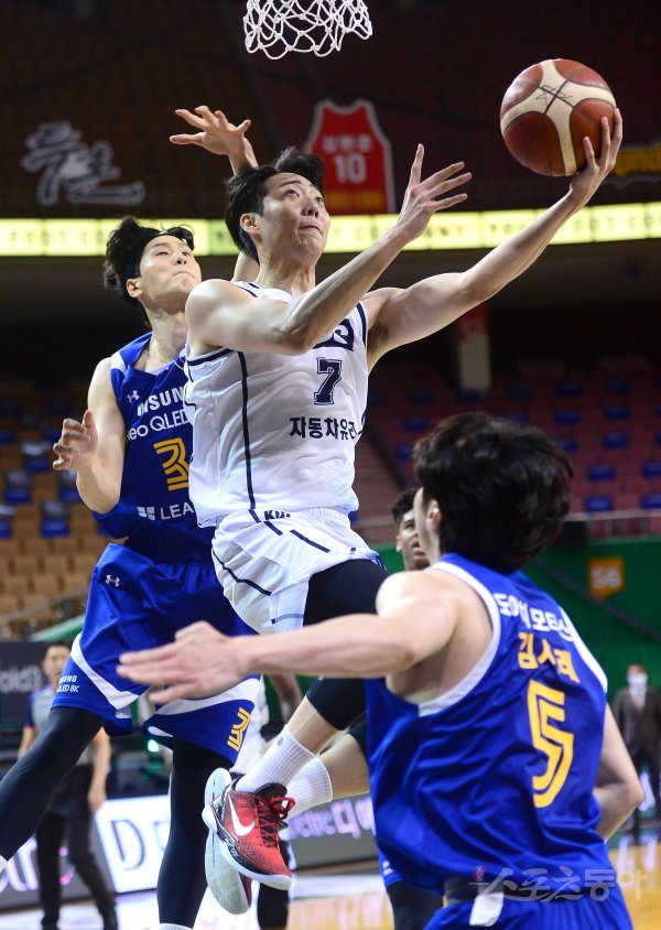 13일 서울 잠실체육관에서 열린 ‘2021-2022 프로농구’ 서울 삼성과 전주 KCC 경기에서 KCC 정창영이 삼성의 수비를 뚫고 레이업슛을 하고 있다.