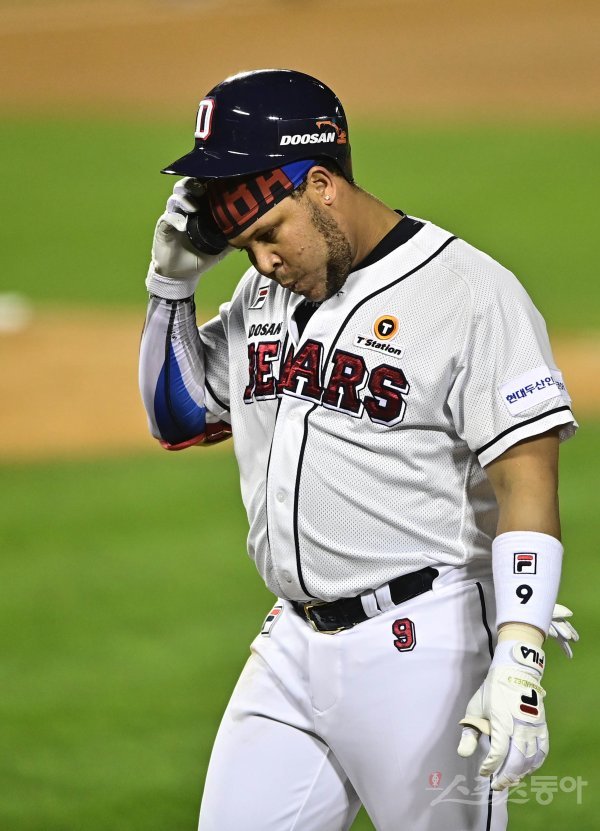 13일 서울 잠실야구장에서 열린 ‘2021 신한은행 SOL KBO리그’에서 두산 베어스와 KT 위즈의 경기에서 3회말 1사 두산 페르난데스가 2루수 뜬공으로 아웃된 뒤 아쉬워하고 있다.