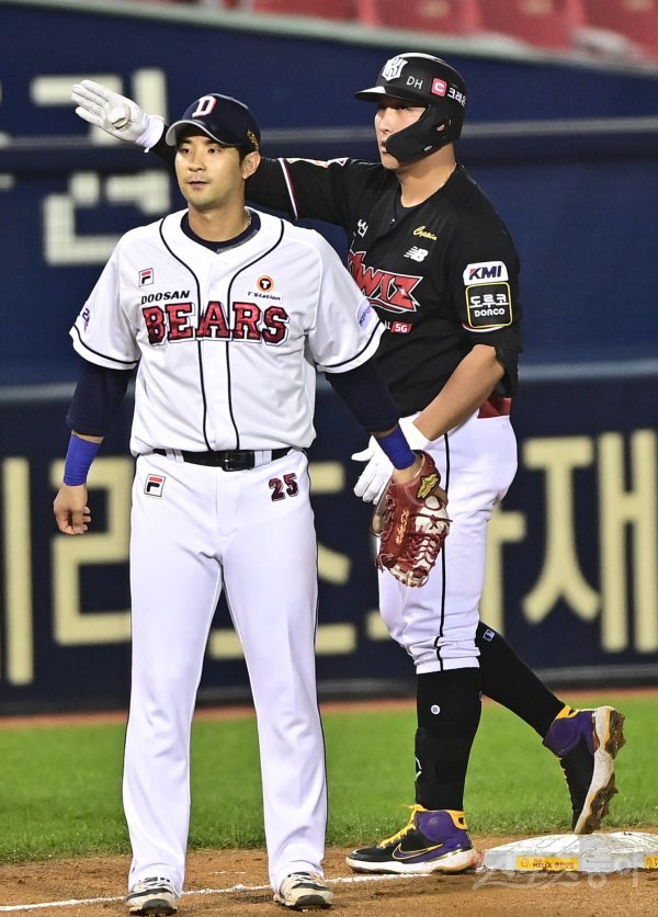 13일 서울 잠실야구장에서 열린 ‘2021 신한은행 SOL KBO리그’에서 두산 베어스와 KT 위즈의 경기에서 3회초 무사 1루 KT 황재균이 1타점 중전 3루타를 쳐낸 뒤 더그아웃을 향해 세리머니를 하고 있다.