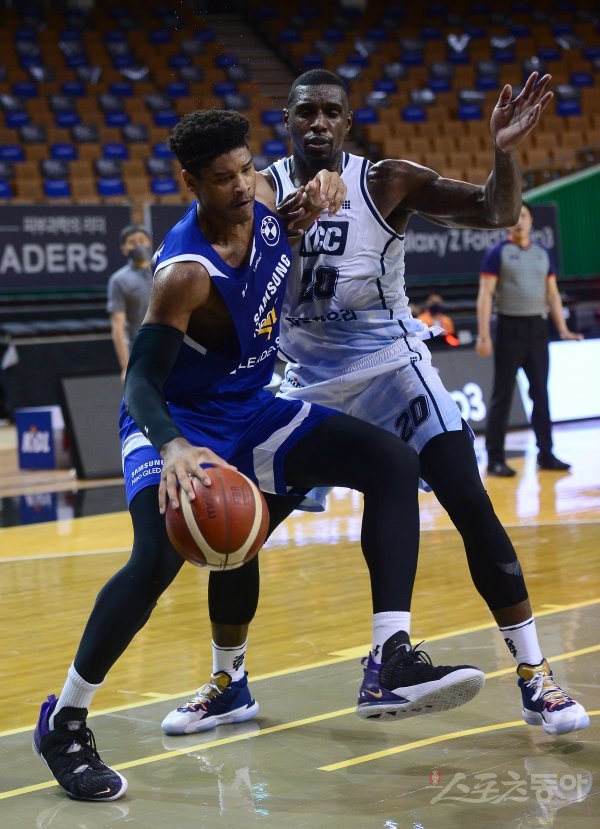 13일 서울 잠실체육관에서 열린 ‘2021-2022 프로농구’ 서울 삼성과 전주 KCC 경기에서 삼성 힉스가 KCC 라건아의 수비를 뚫고 골밑을 공격하고 있다.