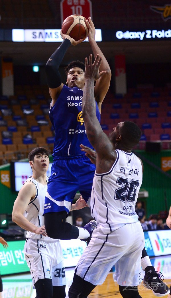 13일 서울 잠실체육관에서 열린 ‘2021-2022 프로농구’ 서울 삼성과 전주 KCC 경기에서 삼성 힉스가 KCC의 수비를 뚫고 골밑 슛을 하고 있다.