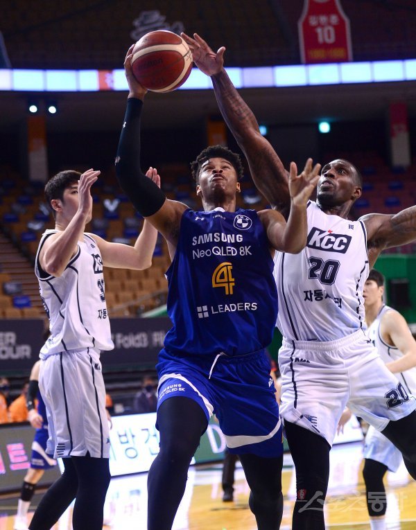 13일 서울 잠실체육관에서 열린 ‘2021-2022 프로농구’ 서울 삼성과 전주 KCC 경기에서 삼성 힉스가 KCC라건아의 수비를 뚫고 골밑을 공격하고 있다.