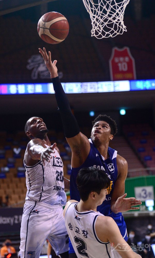 13일 서울 잠실체육관에서 열린 ‘2021-2022 프로농구’ 서울 삼성과 전주 KCC 경기에서 삼성 힉스가 KCC의 수비를 뚫고 골밑 슛을 하고 있다.