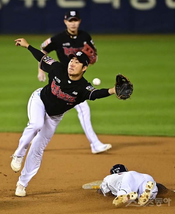 13일 서울 잠실야구장에서 열린 ‘2021 신한은행 SOL KBO리그’에서 두산 베어스와 KT 위즈의 경기에서 7회말 1사 1루 상황에서 KT 2루수 신본기가 두산 1루주자에게 도루를 허용하고 있다.