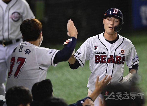 13일 서울 잠실야구장에서 열린 ‘2021 신한은행 SOL KBO리그’에서 두산 베어스와 KT 위즈의 경기에서 8회말 1사 3루 KT의 폭투를 틈타 3루주자 박지훈이 득점에 성공한 뒤 더그아웃에서 동료들의 축하를 받고 있다.