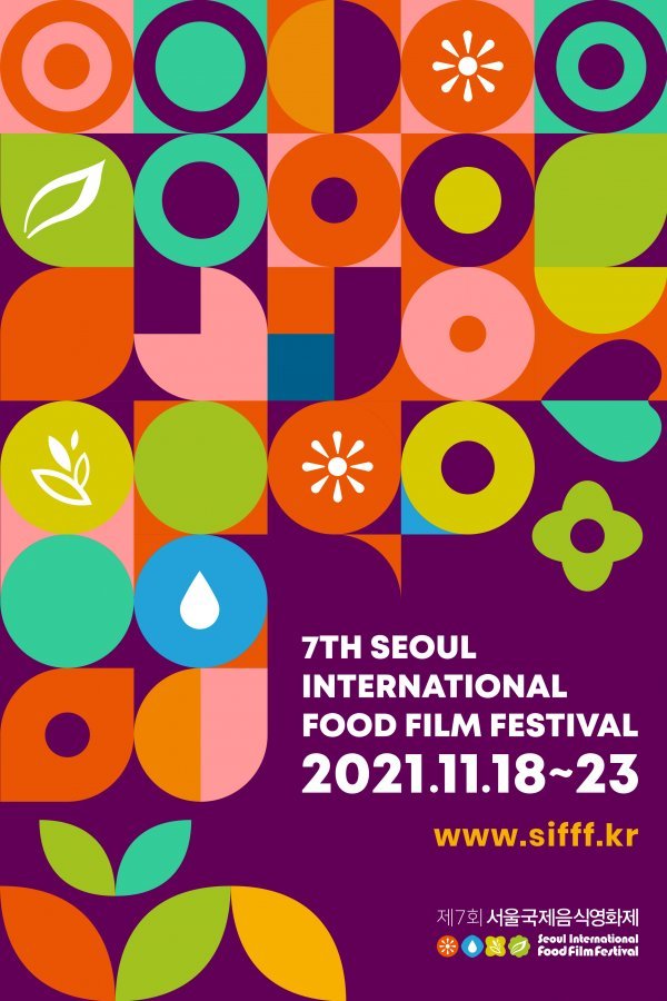 제7회 서울국제음식영화제의 포스터는 서울국제음식영화제의 공식 로고에 담긴 태양과 물, 벼와 잎의 그래픽 모티브를 활용한 디자인으로 구성돼 있다. 생명의 근원이 되는 태양과 물, 우리 삶의 기본 양식을 상징하는 벼와 잎의 상징적 이미지와 더불어 만물을 이루는 점, 선, 면의 확장으로 문화적, 영화적 다양성을 추구하는 서울국제음식영화제의 지향을 드러내고 있다. 다채로운 도형들의 주축을 이루는 원의 형태는 다양한 음식을 담아내는 그릇, 영화에 쓰이는 카메라 렌즈와 필름 릴, 사람들이 함께 모이는 축제의 공간 또는 분위기 등을 연상하게 하기도 한다. 다양한 해석과 상상력을 불러일으키는 추상적 모티브의 알록달록한 색감이 조화를 이루는 올해 영화제의 포스터 이미지는 팬데믹 시대에 함께 나눠 먹는 즐거움을 생각하며 화사하게 피어나는 풍성한 축제의 꿈을 담고 있기도 하다.