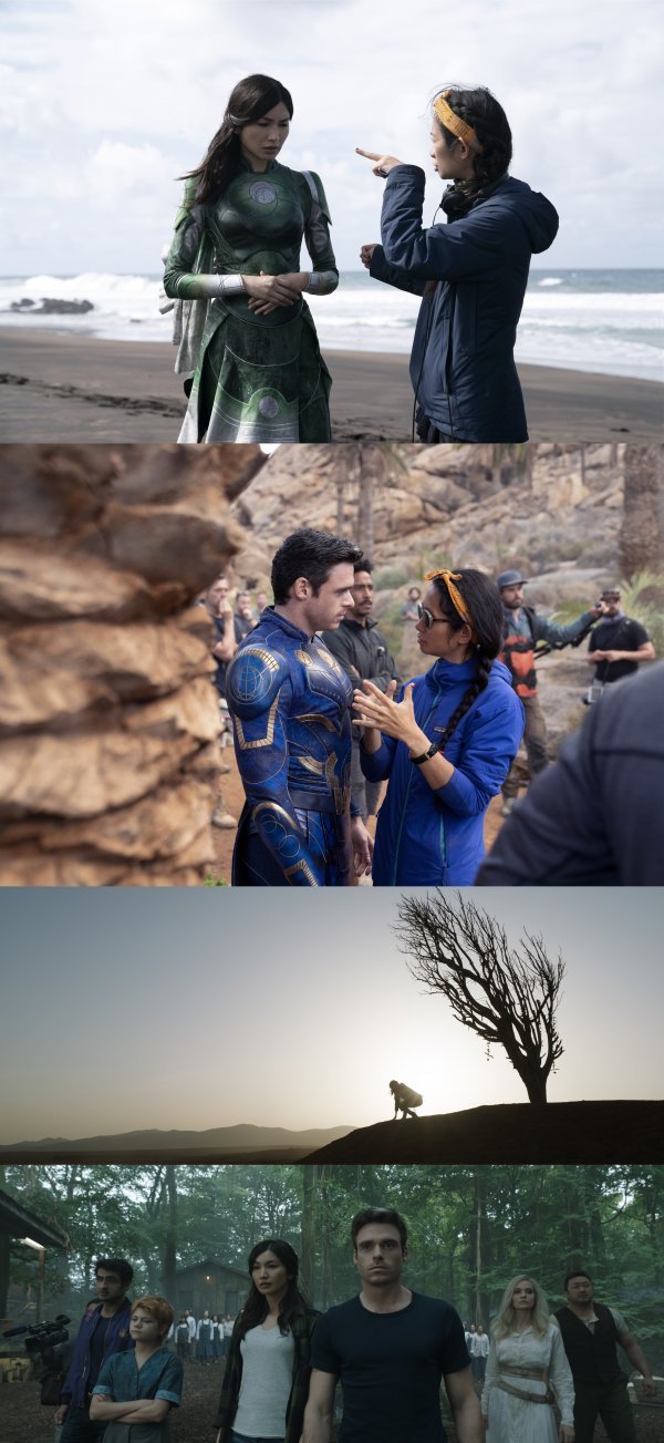 이번에 공개된 ‘클라스 스틸’은 기존 마블 작품들과 차별화된 클로이 자오 감독만의 새로운 방식으로 그려낸 '이터널스'의 다양한 모습을 엿볼 수 있다. 먼저 클로이 자오 감독이 ‘세르시’ 역을 맡은 젬마 찬, ‘이카리스’ 역을 맡은 리차드 매든과 함께 진지하게 의견을 주고받는 모습이 눈길을 끈다. 그린 스크린이 아닌 실제 로케이션 촬영지를 배경으로 해 독보적 비주얼에 대한 기대감을 자극한다.