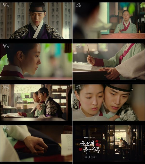 이 가운데 14일 ‘옷소매 붉은 끝동’의 네 번째 티저 예고편이 공개됐다. 공개된 영상은 이산과 성덕임의 가슴 설레는 눈맞춤과 함께 시작된다. 시강원에서 홀로 서책을 읽고 있던 이산은 자꾸만 흐트러지는 집중력 탓에 곤란해 하는 모습. 결국 이산은 책을 덮고 창문 너머를 보는데 그의 시선 끝에 건너편 서고에 앉아있던 덕임의 모습이 비춰지며, 이산의 온 신경을 빼앗은 것이 다름 아닌 덕임이었음이 드러난다.