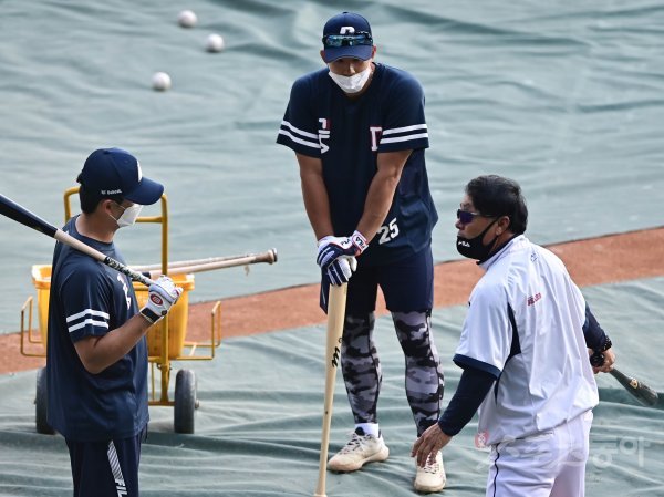 14일 서울 잠실야구장에서 열린 ‘2021 신한은행 SOL KBO리그’에서 두산 베어스와 KT 위즈의 경기에서 두산 이정훈 코치가 선수들에게 타격 지도를 하고 있다.