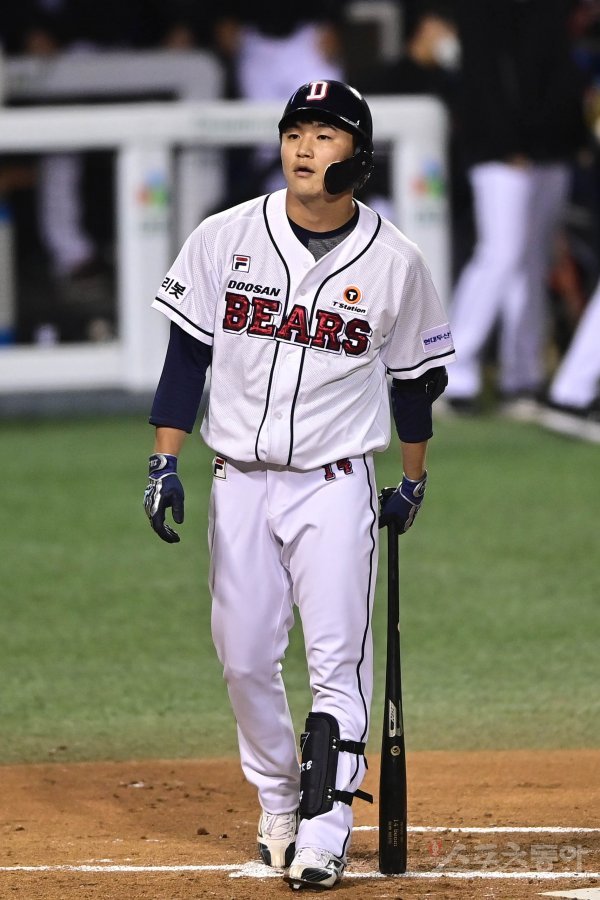 14일 서울 잠실야구장에서 열린 ‘2021 신한은행 SOL KBO리그’에서 두산 베어스와 KT 위즈의 경기에서 1회말 2사 만루 두산 박계범이 삼진 아웃을 당한 뒤 아쉬워하고 있다.