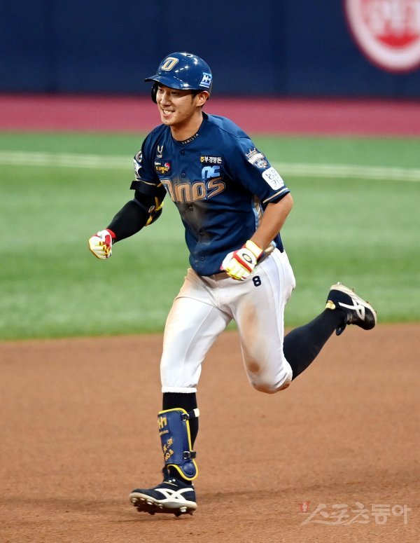 14일 서울 고척스카이돔에서 ‘2021 신한은행 SOL KBO리그’ 키움 히어로즈와 NC 다이노스의 경기가 열렸다. 6회초 2사 1루에서 NC 김기환이 투런 홈런을 쏘아 올린 뒤 그라운드를 돌며 환호하고 있다.