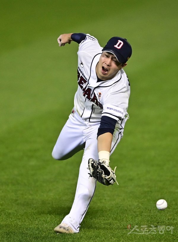 14일 서울 잠실야구장에서 열린 ‘2021 신한은행 SOL KBO리그’에서 두산 베어스와 KT 위즈의 경기에서 6회초 1사 1, 2루 KT의 타구를 두산 박건우가 놓치고 있다.