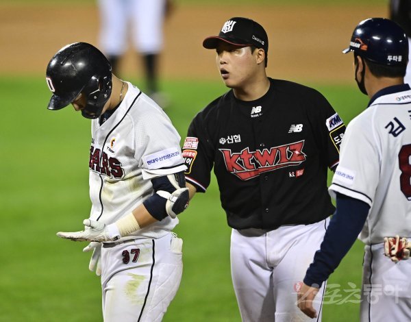 14일 서울 잠실야구장에서 열린 ‘2021 신한은행 SOL KBO리그’에서 두산 베어스와 KT 위즈의 경기에서 5회말 1사 KT 강백호가 수비 과정에서 두산 박건우와 충돌한 뒤 미안함을 표시하고 있다.