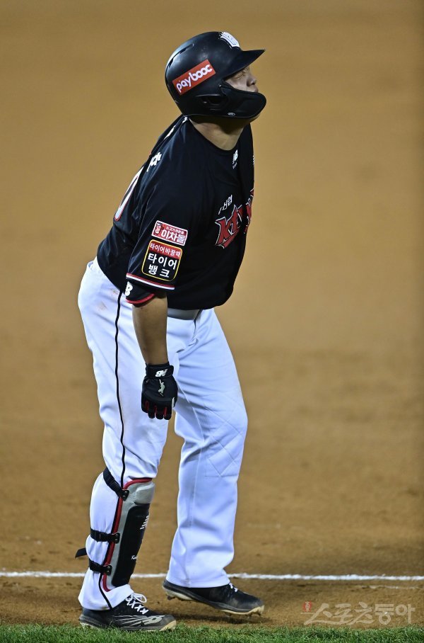14일 서울 잠실야구장에서 열린 ‘2021 신한은행 SOL KBO리그’에서 두산 베어스와 KT 위즈의 경기에서 6회초 2사 만루 KT 강백호가 내야 땅볼로 아웃된 뒤 무릎 통증을 호소하고 있다.