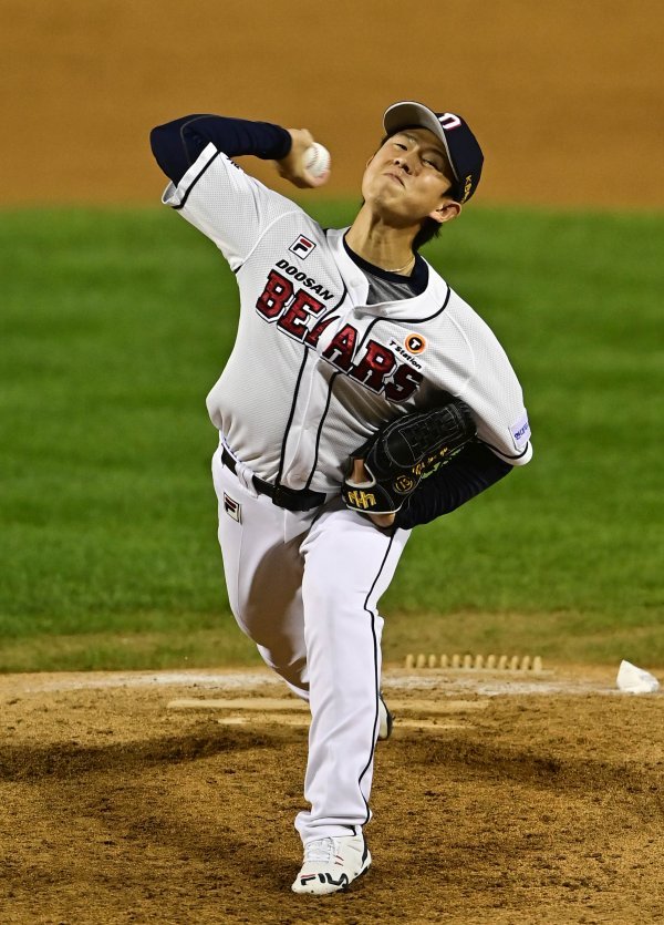 14일 서울 잠실야구장에서 열린 ‘2021 신한은행 SOL KBO리그’에서 두산 베어스와 KT 위즈의 경기에서 9회초 두산 유재유가 교체로 마운드에 올라 역투하고 있다.