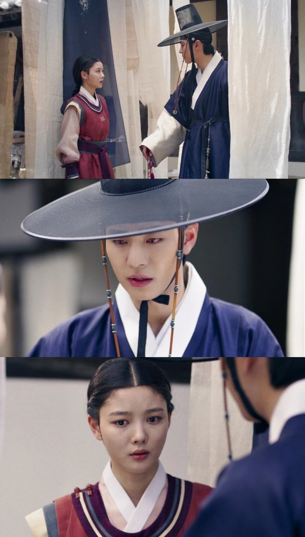 공개된 사진 속 하람과 홍천기는 사람들의 시선을 피해 저잣거리 구석에서 만난 모습이다. 누군가에게 쫓기는 듯 주변을 살피는 이들의 모습이 긴장감을 높인다. 이어 하람은 홍천기에게 심각한 표정으로 빠르게 무언가를 말하고, 이를 들은 홍천기는 생각에 잠긴 듯한 얼굴이다. 애틋함 보다는 다급함이 느껴지는 이들의 모습이 과연 어떤 대화를 나눈 것인지 궁금증을 자극한다.