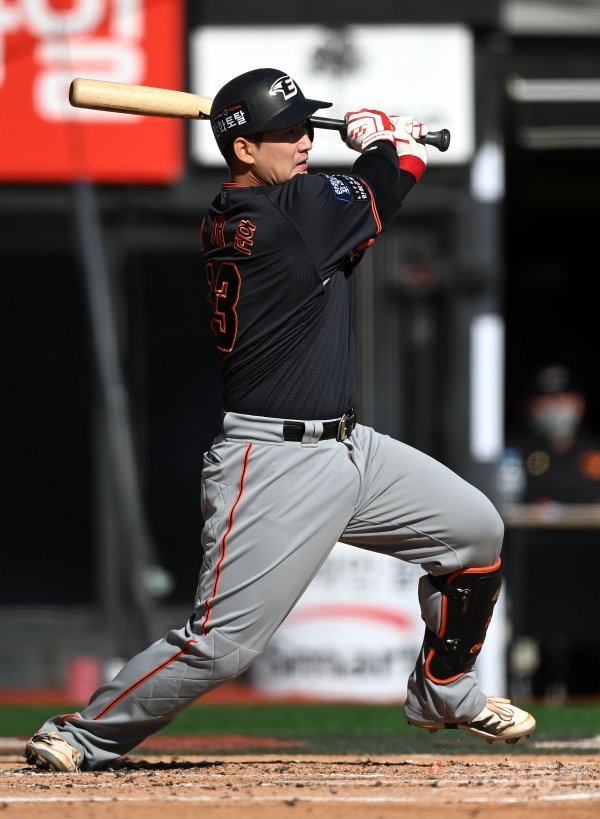 17일 수원KT위즈파크에서 ‘2021 신한은행 SOL KBO리그’ 한화 이글스와 KT 위즈 경기가 열렸다. 3회초 2사 2루 한화 최재훈이 선제 1타점 적시타를 치고 있다.