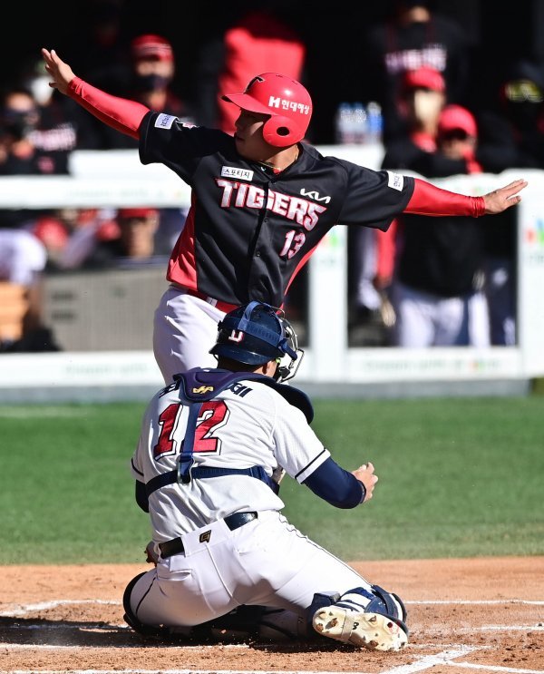 17일 서울 잠실야구장에서 열린 ‘2021 신한은행 SOL KBO리그’에서 두산 베어스와 KIA 타이거즈의 경기에서 2회초 1사 1, 3루 KIA의 내야 땅볼 때 3루주자 이창진이 홈으로 파고들어 세이프 되고 있다.