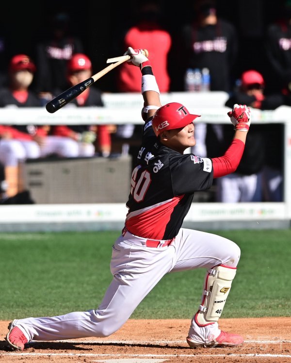 17일 서울 잠실야구장에서 열린 ‘2021 신한은행 SOL KBO리그’에서 두산 베어스와 KIA 타이거즈의 경기에서 2회초 1사 2루 KIA 권혁경이 우전 안타를 치고 있다.