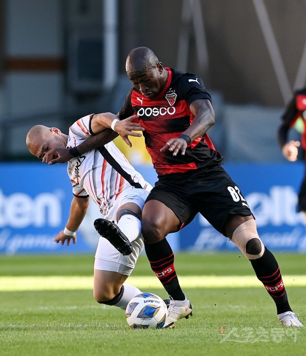 17일 전북 전주월드컵경기장에서 열린 ‘2021 아시아축구연맹(AFC) 챔피언스리그’ 포항 스틸러스와 나고야 그램퍼스(일본)의 8강경기에서 포항 팔라시오스가 나고야 선수와 볼 다툼을 벌이고 있다.