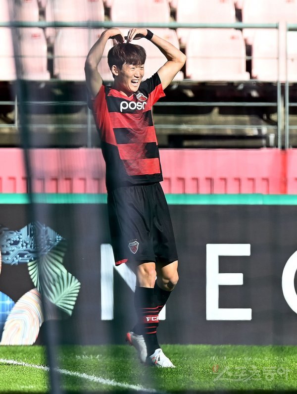 17일 전북 전주월드컵경기장에서 열린 ‘2021 아시아축구연맹(AFC) 챔피언스리그’ 포항 스틸러스와 나고야 그램퍼스(일본)의 8강경기에서 포항 이승모가 팀의 2번째 골을 넣고 세리머니를 펼치고 있다.