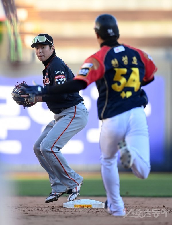 17일 수원KT위즈파크에서 ‘2021 신한은행 SOL KBO리그’ 한화 이글스와 KT 위즈 경기가 열렸다. 9회말 1사 1루 KT 내야 땅볼 때 한화 정은원이 1루주자를 포스 아웃시킨 후 1루로 송구하고 있다.