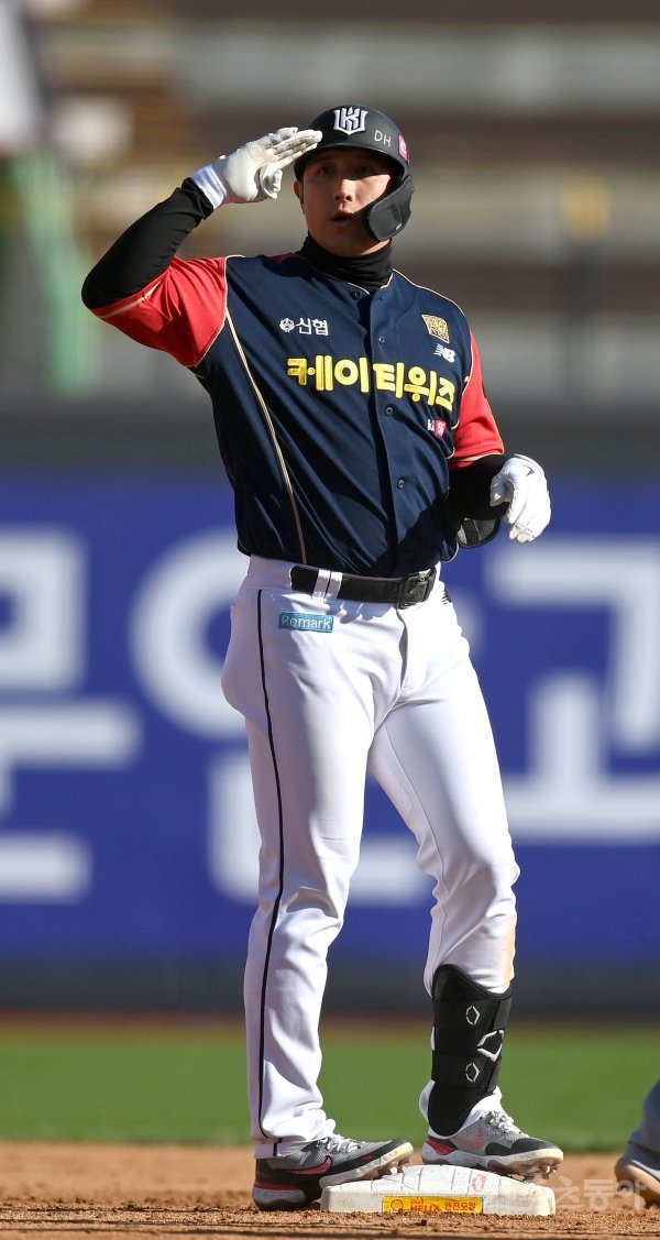 17일 수원KT위즈파크에서 ‘2021 신한은행 SOL KBO리그’ 한화 이글스와 KT 위즈 경기가 열렸다. 5회말 2사 2루 KT 황재균이 동점을 만드는 1타점 우전 2루타를 치고 2루에서 기뻐하고 있다.