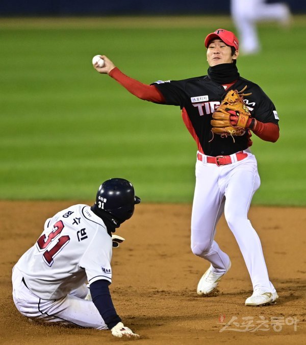 17일 서울 잠실야구장에서 열린 ‘2021 신한은행 SOL KBO리그’에서 두산 베어스와 KIA 타이거즈의 더블헤더 2차전 경기에서 4회말 무사 1루 두산의 내야 땅볼 때 KIA 박찬호가 1루주자를 포스 아웃시킨 뒤 1루로 송구하고 있다.