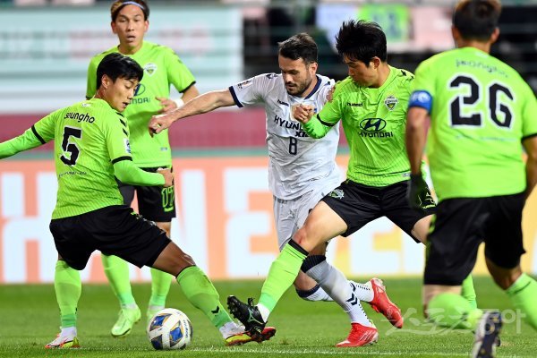 17일 전북 전주월드컵경기장에서 열린 ‘2021 아시아축구연맹(AFC) 챔피언스리그’ 전북 현대와 울산 현대의 8강 경기에서 울산 바코가 전북 수비 사이로 돌파하고 있다.
