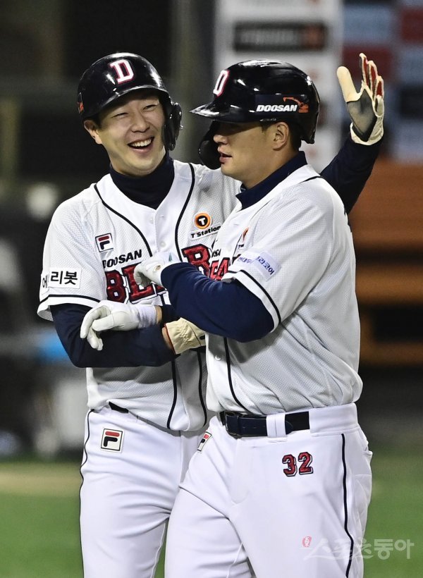 17일 서울 잠실야구장에서 열린 ‘2021 신한은행 SOL KBO리그’에서 두산 베어스와 KIA 타이거즈의 더블헤더 2차전 경기에서 6회말 무사 1, 2루 두산 김재환이 역전 우월 3점 홈런을 쳐낸 뒤 박건우의 축하를 받고 있다.