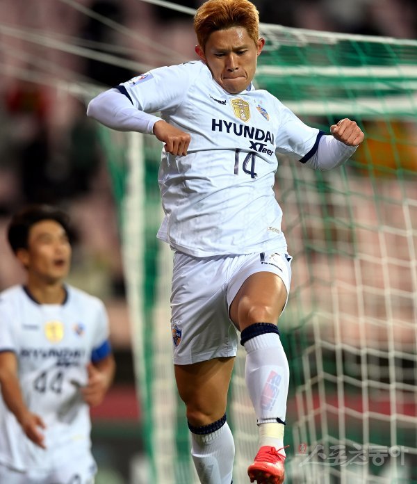 17일 전북 전주월드컵경기장에서 열린 ‘2021 아시아축구연맹(AFC) 챔피언스리그’ 전북 현대와 울산 현대의 8강 경기에서 울산 이동경기 골을 성공시킨 뒤 환호하고 있다.
