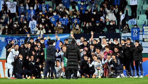 17일 전북 전주월드컵경기장에서 열린 ‘2021 아시아축구연맹(AFC) 챔피언스리그’ 전북 현대와 울산 현대의 8강 경기에서 울산이 연장전 끝에 전북을 상대로 3-2로 승리한 뒤 선수들이 기념촬영을 하고 있다.