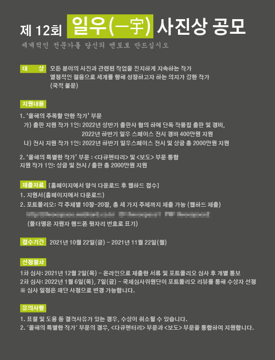 ‘12회 일우사진상’은 ‘올해의 주목할 만한 작가’ 중 전시부문과 출판부문에서 각 1명, ‘올해의 특별한 작가’ 1명 등 3명을 선정한다. 이번에 ‘올해의 특별한 작가’ 부분에는 보도사진 부문과 자연 및 환경 다큐멘터리 부문의 지원자를 통합하여 선정한다. 공모는 22일부터 11월22일까지며 응모는 지원서와 주제별 포트폴리오를 일우사진상 홈페이지 양식에 따라 일우재단 웹하드에 업로드하면 된다.