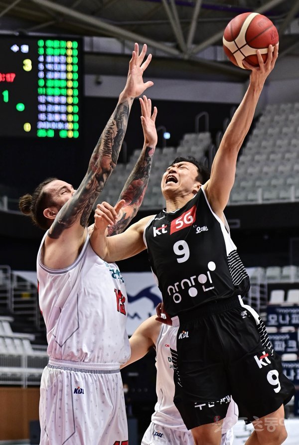 18일 경기도 수원KT소닉붐아레나에서 열린 ‘2021-2022 KGC 인삼공사 정관장 프로농구’ 수원 KT와 고양 오리온의 경기에서 KT 김영환이 오리온 수비 앞에서 슛을 쏘고 있다.