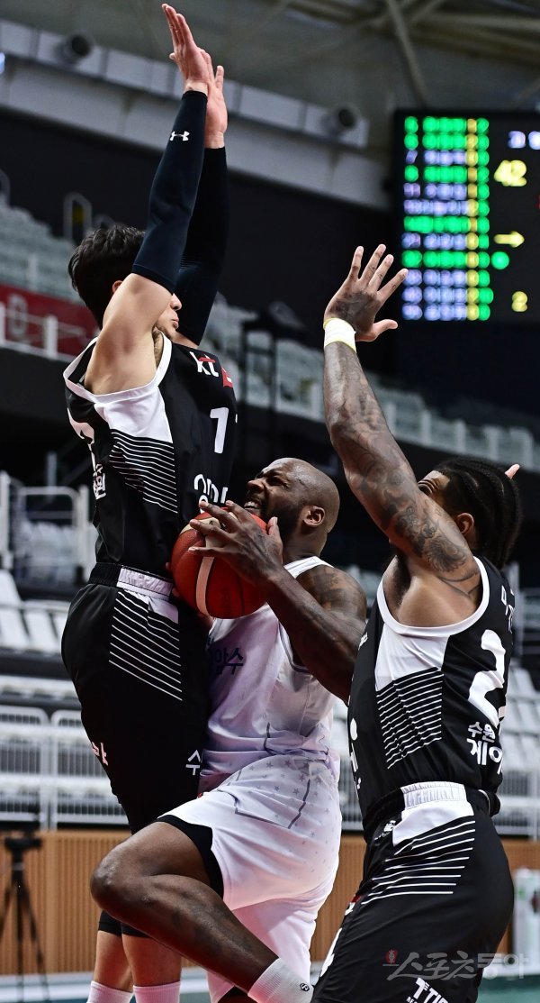 18일 경기도 수원KT소닉붐아레나에서 열린 ‘2021-2022 KGC 인삼공사 정관장 프로농구’ 수원 KT와 고양 오리온의 경기에서 오리온 할로웨이가 KT의 수비수들 사이에서 슛을 쏘고 있다.