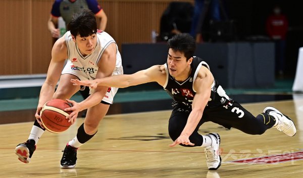 18일 경기도 수원KT소닉붐아레나에서 열린 ‘2021-2022 KGC 인삼공사 정관장 프로농구’ 수원 KT와 고양 오리온의 경기에서 KT 정성우가 오리온 한호빈을 향해 몸을 던지고 있다.