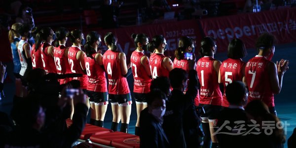 19일 광주 염주종합체육관에서 ‘도드람 2021~2022 V-리그’ 여자부 페퍼저축은행과 KGC인삼공사 경기가 열린다. 창단 개막전 식전행사에서 페퍼저축은행 선수들이 박수를 치고 있다.