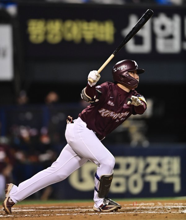 19일 서울 잠실야구장에서 열린 ‘2021 신한은행 SOL KBO리그’에서 LG 트윈스와 키움 히어로즈의 경기에서 2회초 2사 1루 키움 예진원이 선제 1타점 우전 3루타를 치고 있다.