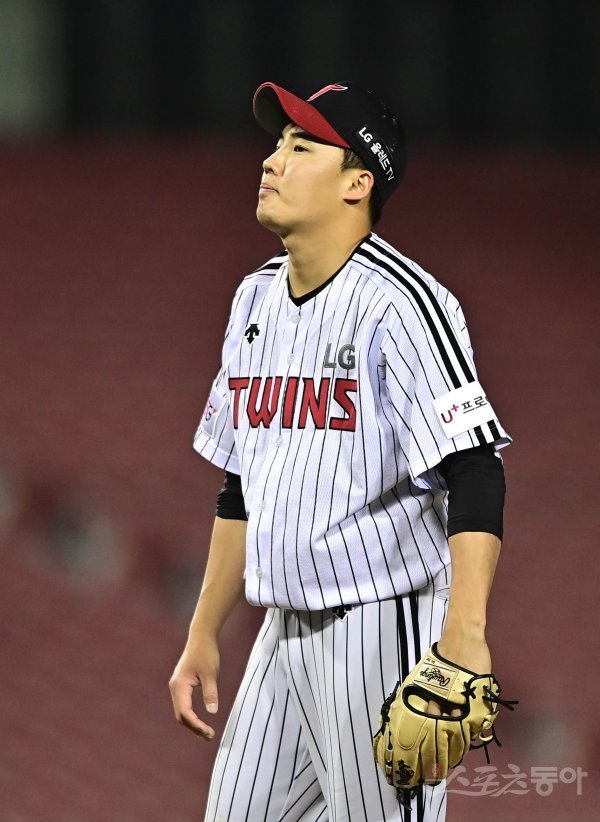 19일 서울 잠실야구장에서 열린 ‘2021 신한은행 SOL KBO리그’에서 LG 트윈스와 키움 히어로즈의 경기에서 5회초 1사 1, 2루 키움에 스리런을 허용한 LG 임찬규가 아쉬워하고 있다.