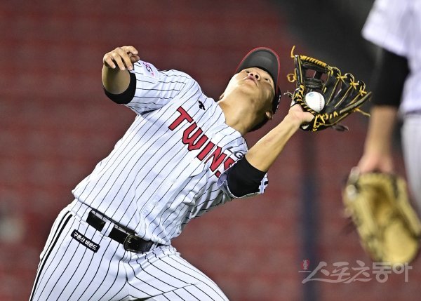 19일 서울 잠실야구장에서 열린 ‘2021 신한은행 SOL KBO리그’에서 LG 트윈스와 키움 히어로즈의 경기에서 4회초 2사 키움의 뜬공 타구를 LG 3루수 문보경이 잡고 있다.