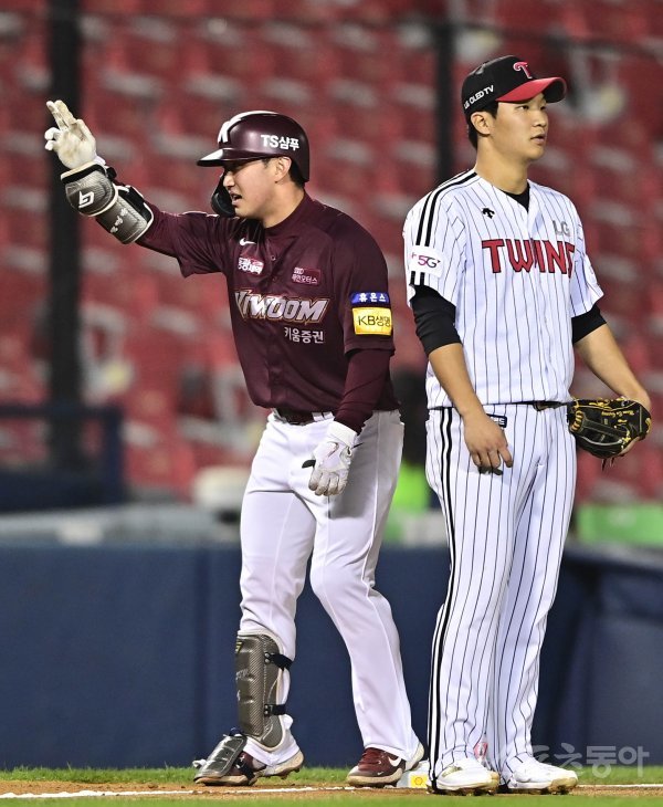 19일 서울 잠실야구장에서 열린 ‘2021 신한은행 SOL KBO리그’에서 LG 트윈스와 키움 히어로즈의 경기에서 2회초 2사 1루 키움 예진원이 선제 1타점 우전 3루타를 쳐낸 뒤 3루측 더그아웃을 향해 세리머니를 하고 있다.