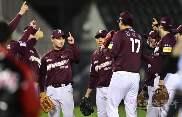 19일 서울 잠실야구장에서 열린 ‘2021 신한은행 SOL KBO리그’에서 LG 트윈스와 키움 히어로즈의 경기에서 키움이 LG에 5-4로 승리를 거둔 뒤 선수들이 기쁨을 나누고 있다.