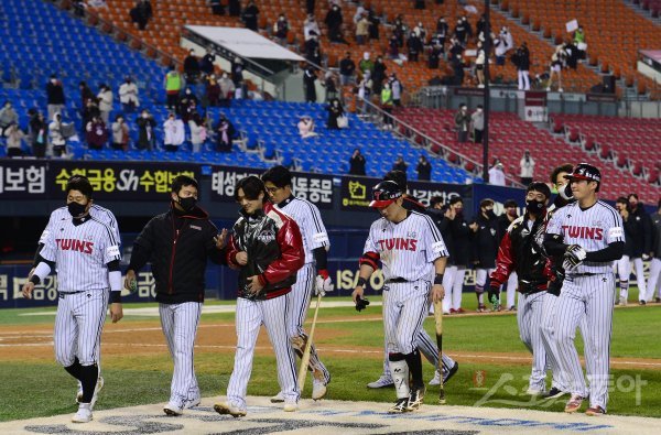 19일 서울 잠실야구장에서 열린 ‘2021 신한은행 SOL KBO리그’에서 LG 트윈스와 키움 히어로즈의 경기에서 LG가 키움에 4-5로 패한 뒤 고개를 숙인 채 더그아웃으로 향하고 있다.