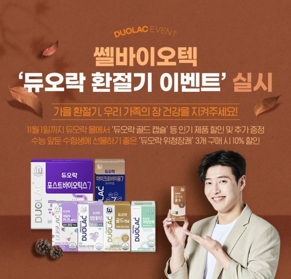 마이크로바이옴 전문 기업 쎌바이오텍이 가을을 맞아 ‘듀오락 환절기 이벤트’를 진행한다.11월1일까지 듀오락 몰에서 환절기 면역력 관리에 필수적인 장 건강 관련 건강기능식품을 최대 20% 할인하고 추가 증정, 2+1 등의 다양한 혜택을 제공한다.