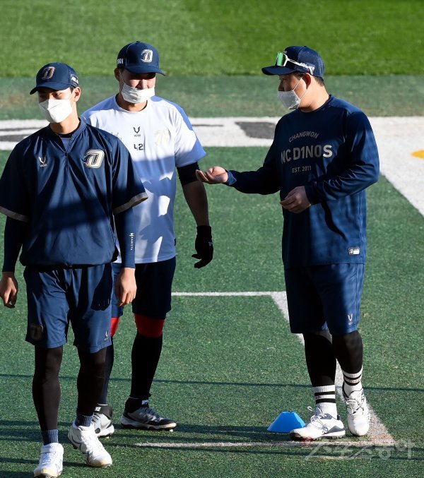 20일 인천 SSG 랜더스필드에서 ‘2021 신한은행 SOL KBO리그’ SSG 랜더스와 NC 다이노스의 경기가 열린다. 경기 전 NC 김태군과 양의지가 이야기를 나누고 있다.