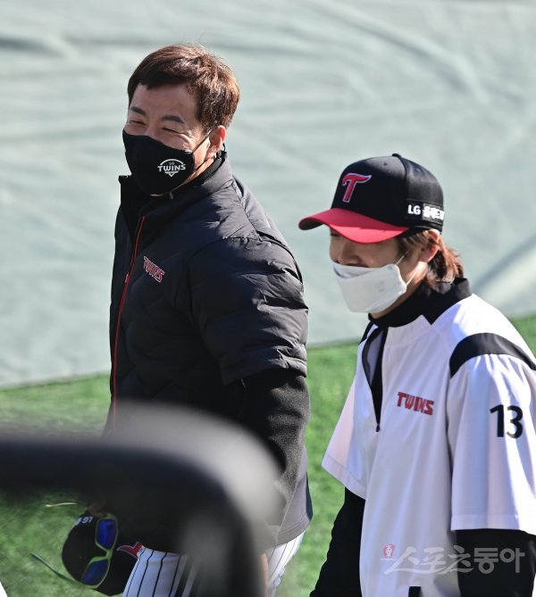 20일 서울 잠실야구장에서 열린 ‘2021 신한은행 SOL KBO리그’에서 LG 트윈스와 키움 히어로즈의 경기에 앞서 LG 고효준이 동료들과 웃으며 이야기를 하고 있다.