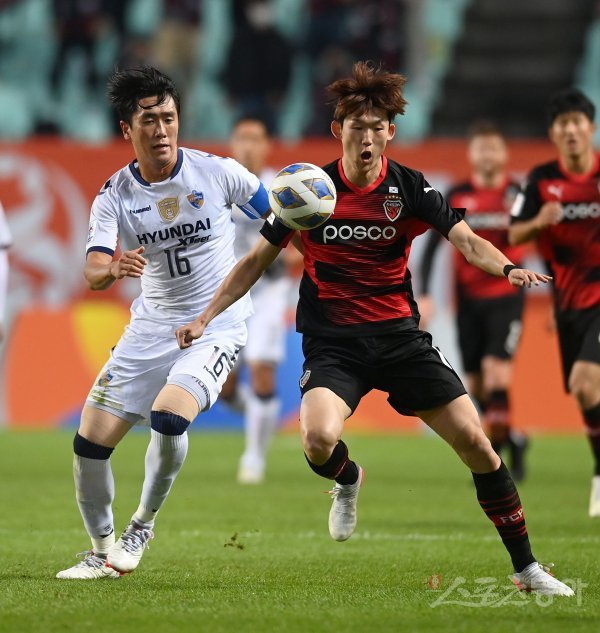 20일 전주월드컵경기장에서 열린 울산과 포항의 2021 아시아축구연맹(AFC) 챔피언스리그(ACL) 4강전에서 포항 이승모가 울산 원두재의 수비를 뚫고 공격하고 있다.