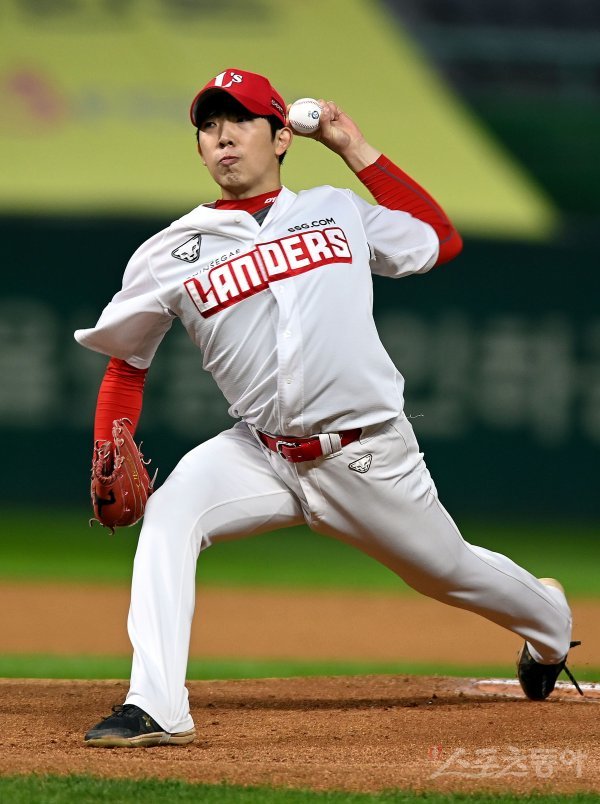 20일 인천 SSG 랜더스필드에서 ‘2021 신한은행 SOL KBO리그’ SSG 랜더스와 NC 다이노스의 경기가 열렸다. SSG 선발투수 오원석이 힘차게 볼을 던지고 있다.